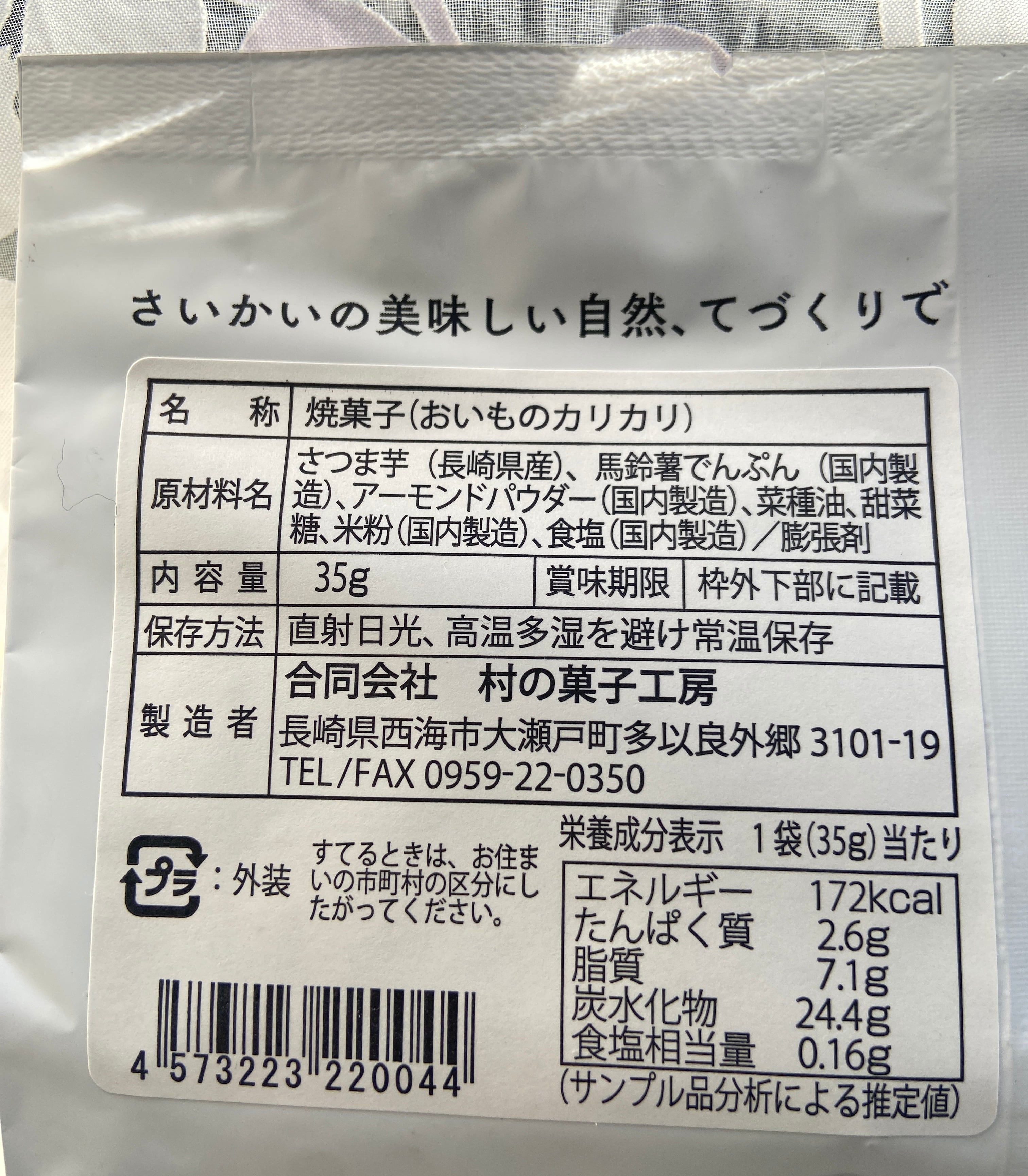 さつま芋(長崎県産)馬鈴薯でんぷん(国内製造)、アーモンドパウダー(国内製造)、菜種油、甜菜糖、米粉(国内産)、食塩(国内製造)/膨張剤
